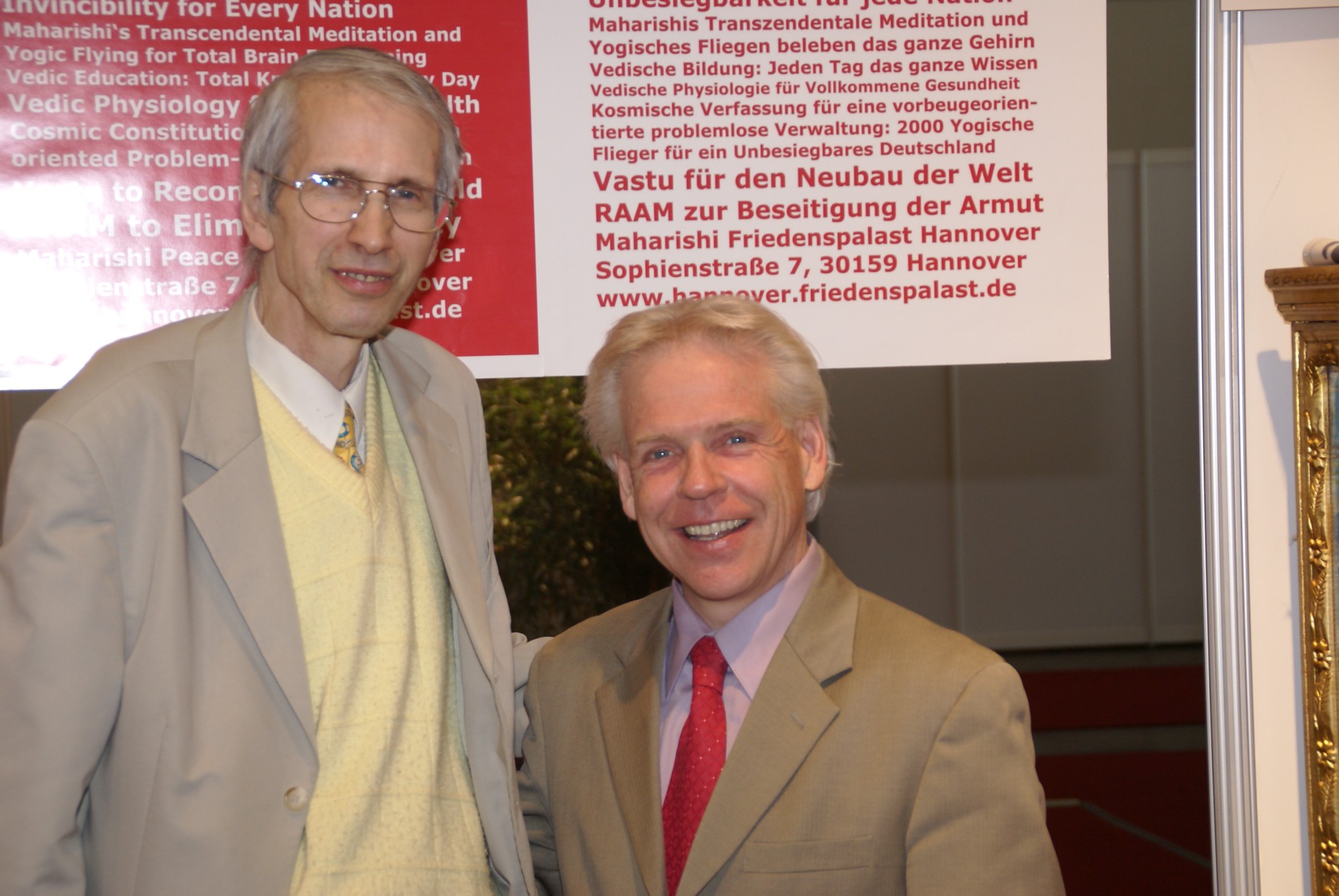 In zahlreichen Einzelgesprächen, z. T. auf hohem intellektuellen Niveau mit hochkarätigen Gesprächspartnern, unterstützt durch Videos und Powerpoint-Shows, fanden aber auch die anderen Vedischen Wissenszweige wie Ayurveda, Sthapatya Veda und Gandharva Veda sowie die zahlreichen Projekte der TM-Organisation - insbesondere die globale alternative Entwicklungswährung „RAAM“ - das Interesse der Besucher.8