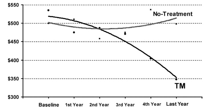 Nicht-TM-Gruppe über sechs Jahre Die Trendlinien zeigen das allgemeine Verhalten der Arztkosten für die beiden Gruppen vom Prä-Intervention-Basisjahr an über fünf Jahre nach Beginn mit der TM-Praxis. Alle Dollar-Werte für medizinische Kosten wurden inflationsbereinigt und sind in kanadischen Dollar (Stand 1992) angegeben. |
